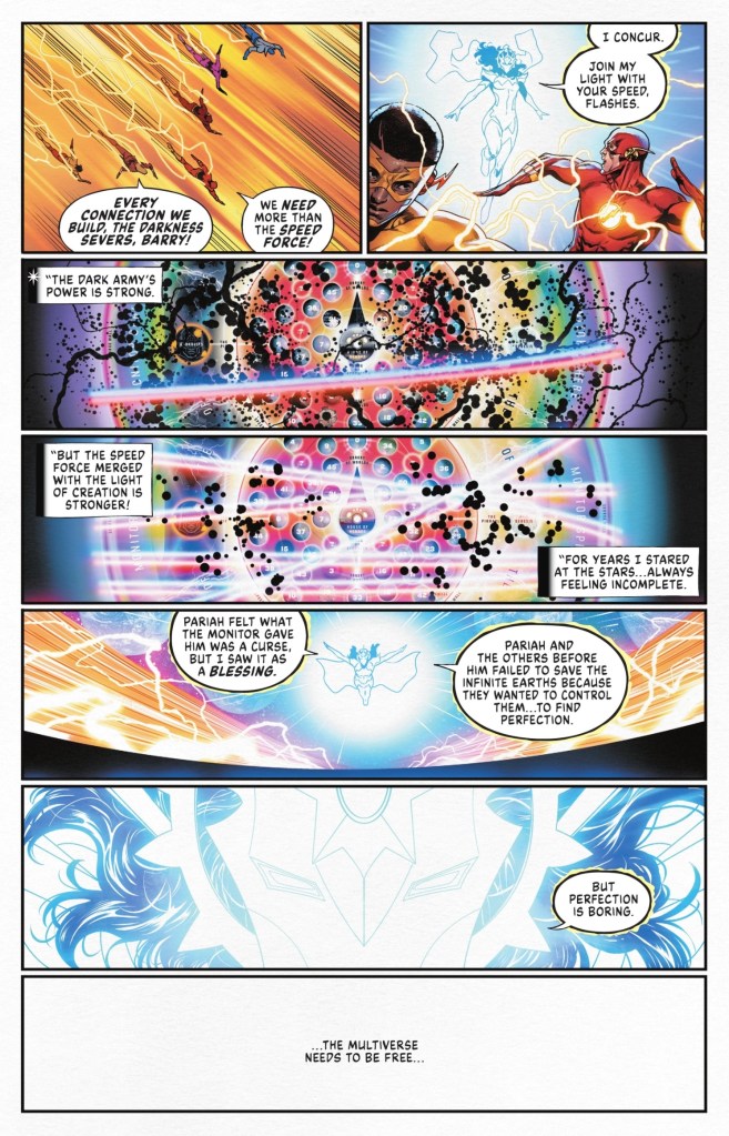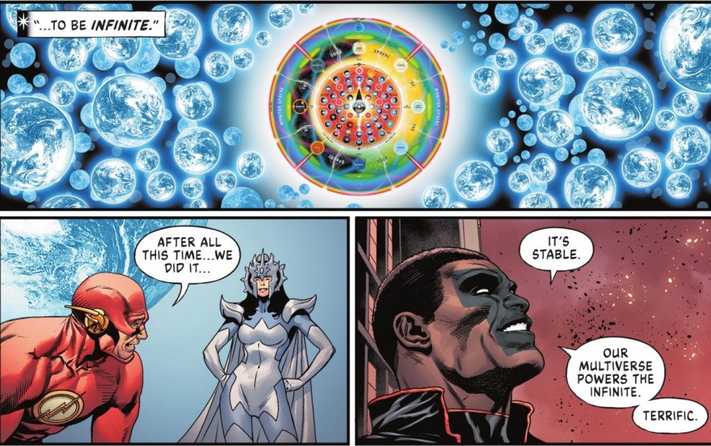Flash put it “Our combined speed can work to repair the connections between our multiverse and the infinite earths.” As Mr. Terrific observed, “It’s stable. Our Multiverse powers the Infinite.” (That seems to me to be Multiversecist. The Infinite is a second class multiverse, powered by the Multiverse?)
