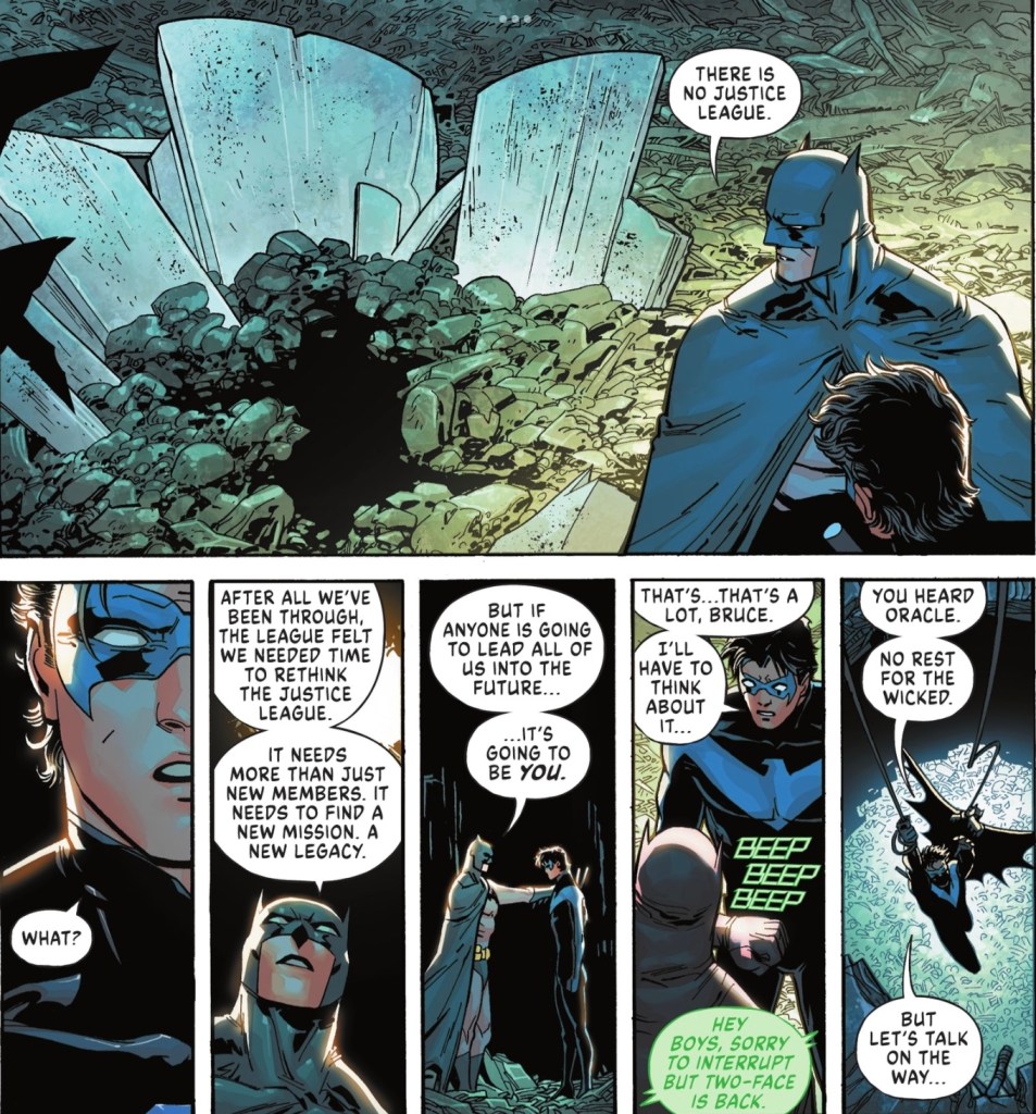 Spot on. If Dick is reluctant it’s because he remembers that he led a kick-bum version of the Titans for years, he doesn’t need to ‘graduate’ to another Batman gig.