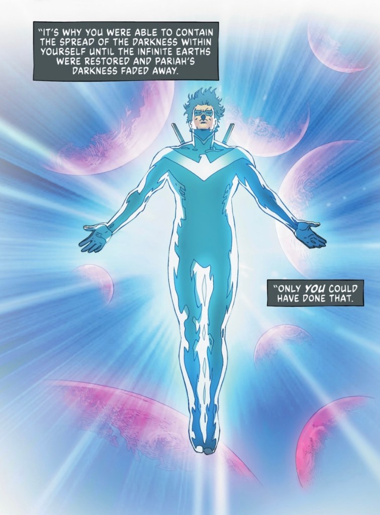 Batman explains it all. Dick Grayson is the light that brightened his days – again, that’s meta business, Robin having been created to cheer up the Batman strips – so of course he can hold back a cosmic force.