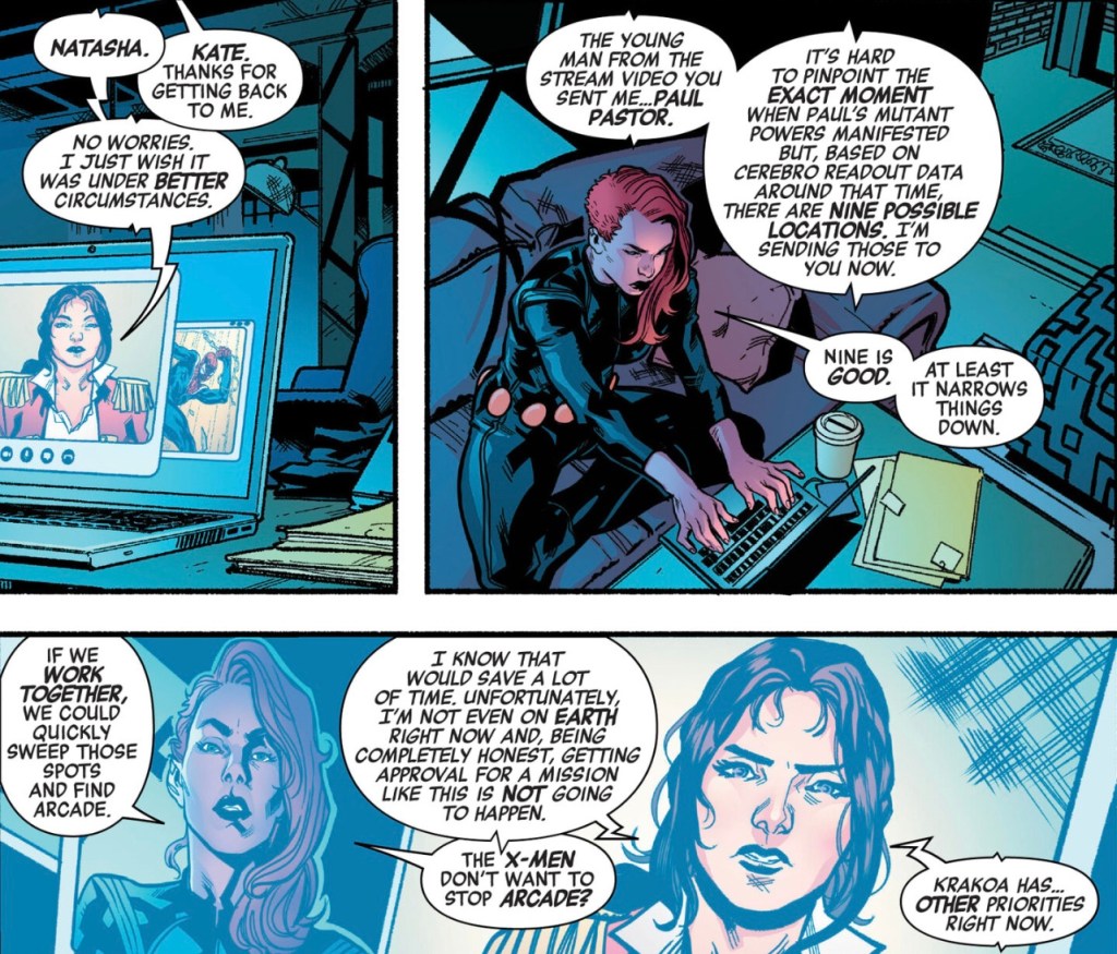Also involved, but outside of Murderworld, is Black Widow, who has her own reasons to track down Arcade. She’s enlisted Kitty Pryde for her information-harvesting talents, but the X-Man will help only so much.