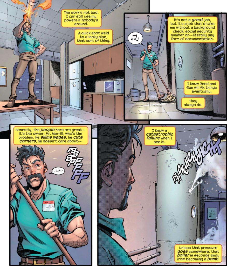 With the Fantastic Four separated and without access to their money, Johnny Storm, in his brand new secret identity of Jonathan Fairweather, has taken a job in a big box store.