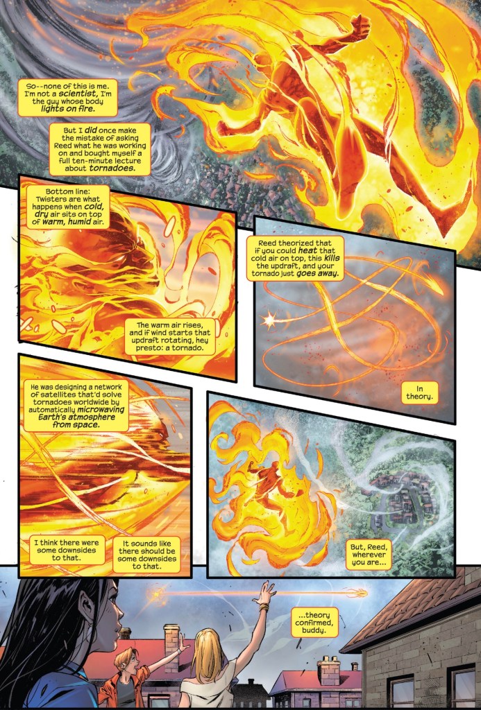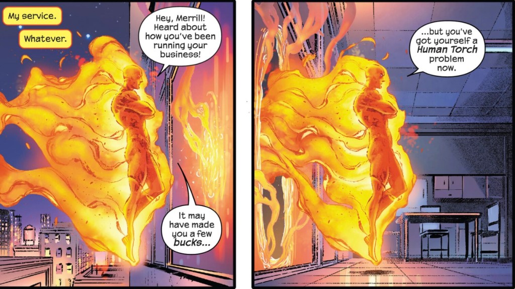 It’s a dilemma – how do you defeat a guy who’s not scared of your power because he knows the Torch would never sear a regular human? Merrill is smart and believes his hotheaded employees is anything but. Johnny thinks that too, as we see at the start of the issue when he’s trying to save Wisconsin from a tornado.