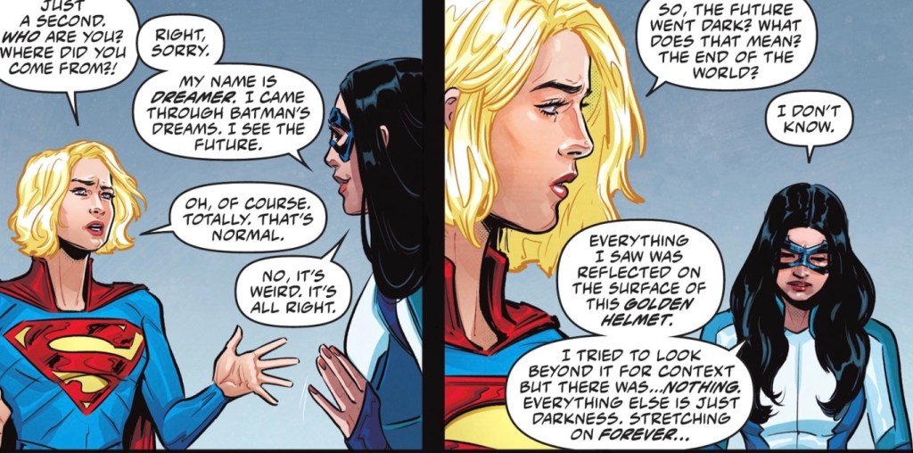 Anyway, we begin with Dreamer from telly’s Supergirl, who recently joined the DC Universe, going on a quest for Dr Fate’s missing helmet.