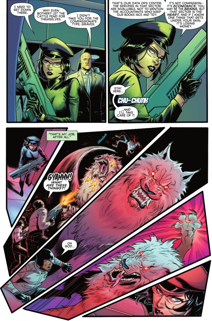 Lex is uncharacteristically hands off, and strangely supportive, in this tale from writer Frank Barbiere and artists Sami Basri and Vicente Cifuentes; I get that it’s setting up chauffeur cosplayer Mercy as a superhero or villain, but there’s no way Lex wouldn’t have leapt into a warsuit rather than cowering in the armoury. There’s no reference to last time Mercy had powers, in the unintelligible Pete Milligan Infinity Inc series, but maybe that was a continuity or two ago. I find it hard to care about Mercy, she’s not a character who seems ripe for redemption and she’s already a bad guy, so where can she go? Still, the art is pleasantly kinetic, and the colours and letters by HiFi and Dave Sharpe respectively help the story along.