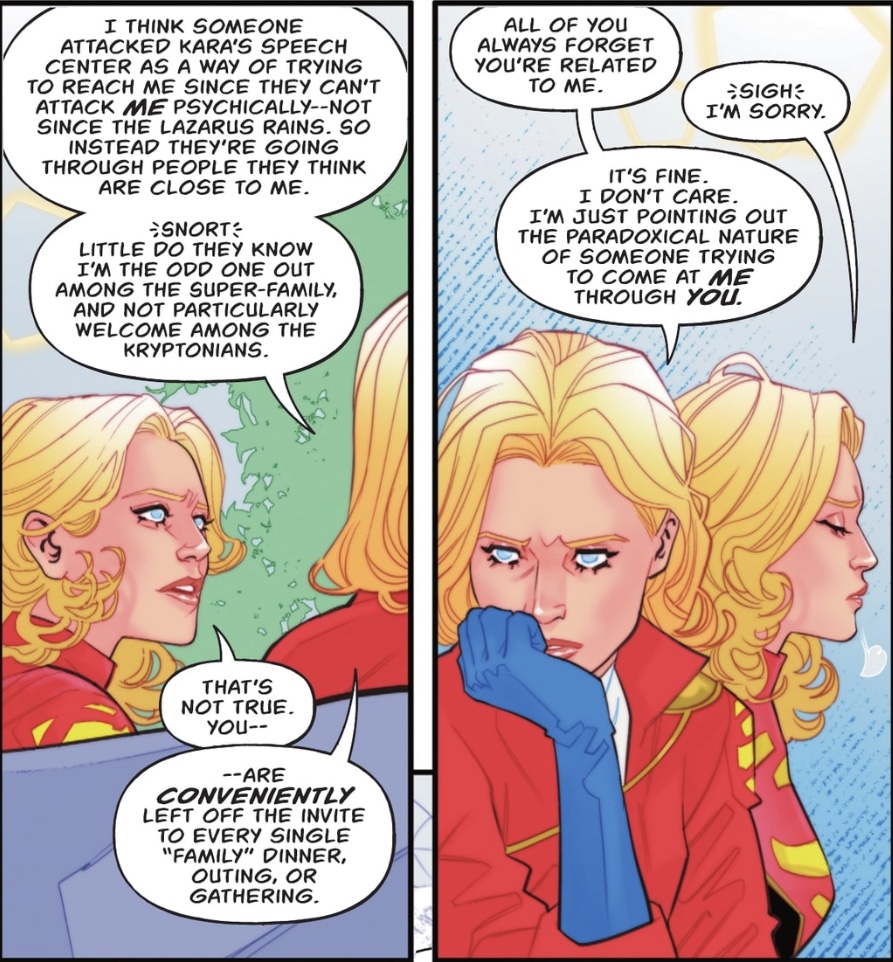 And then there’s the way Power Girl lays down Supergirl’s state of mind.