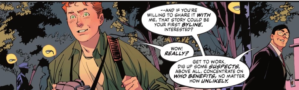 The Titanic Trio aren’t the only ones looking into the mystery – before changing into his union suit, Superman enlisted some red-headed assistance.