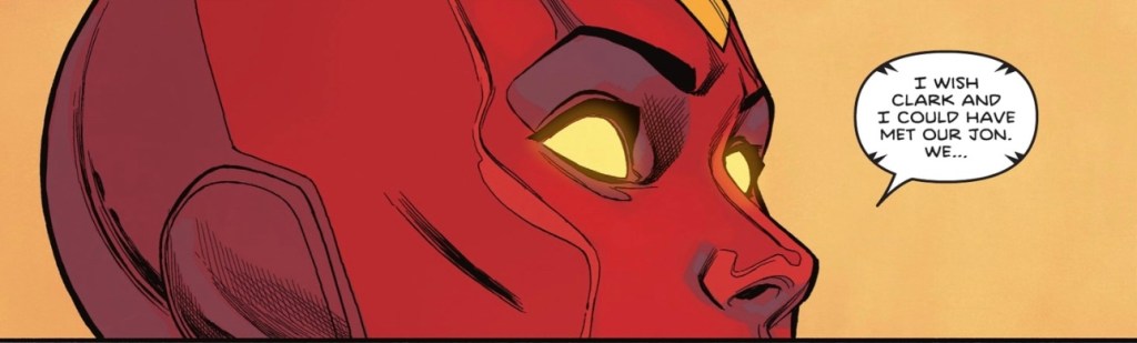 After being given a Fortress crystal containing a message by his mother in case of emergency, Jon, Val-Zod and Red Tornado cross to the unnamed parallel world where Ultraman currently hunts. Just before the monstrous Kryptonian appears, there’s a tender moment between teenager and android.