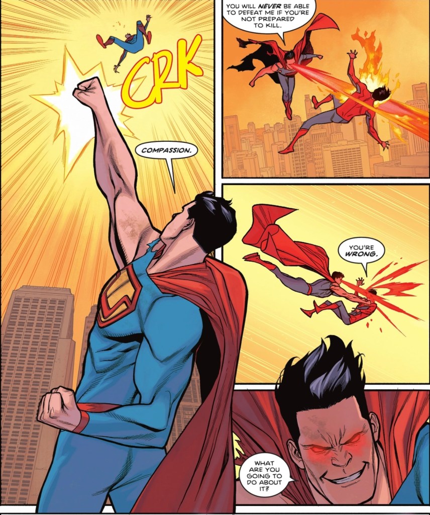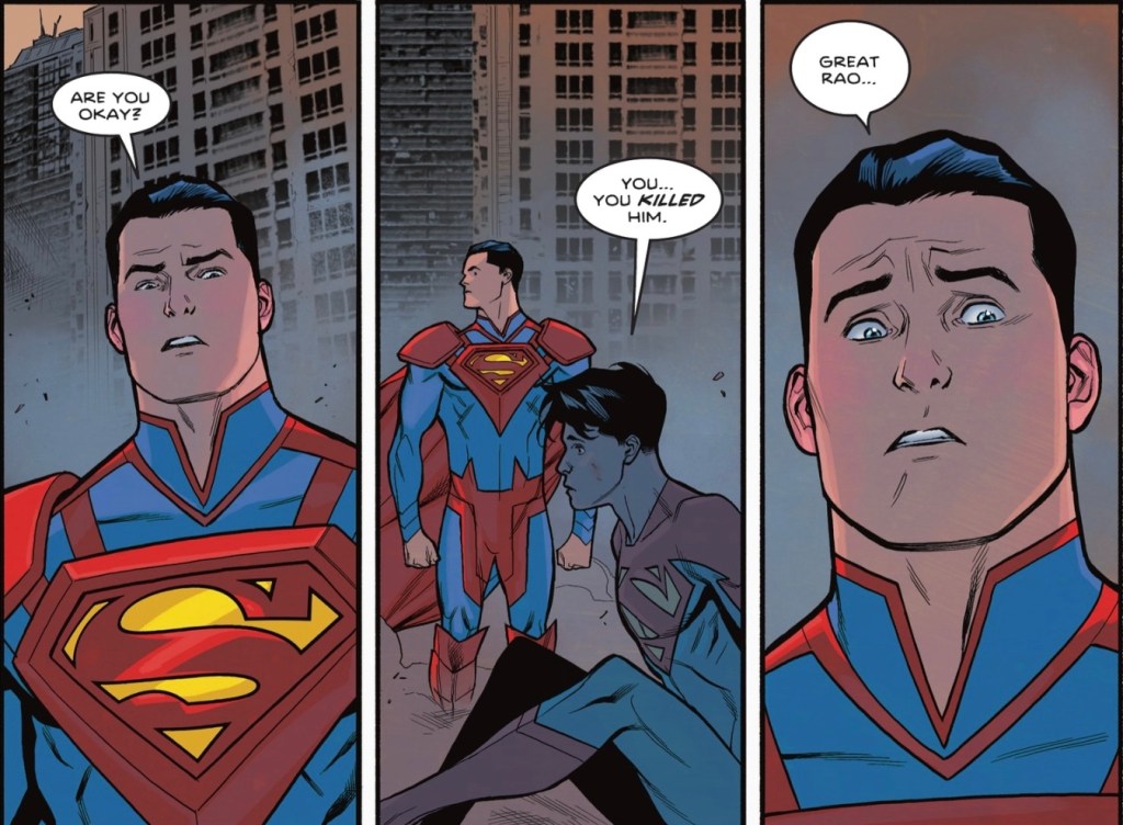 Sweet Grace! This reads like an issue of “Invincible”! Is Taylor that bereft of ideas for Jon Kent? The damage was initiated by Bendis, but Taylor is steadily doing his own. Superman, in any universe, shouldn’t be disposable cut-outs. . .especially if the world soon falls after he dies. Why is Ultraman so powerful; when did it happen? The Injustice universe was destroyed during Covergence, and now it’s back? Val-Zod can’t do anything because it’s Jon’s book?? So much is being done to give Jon some relevance and it’s borderline shameful. So much damage done to a promising character, for no good reason it seems.