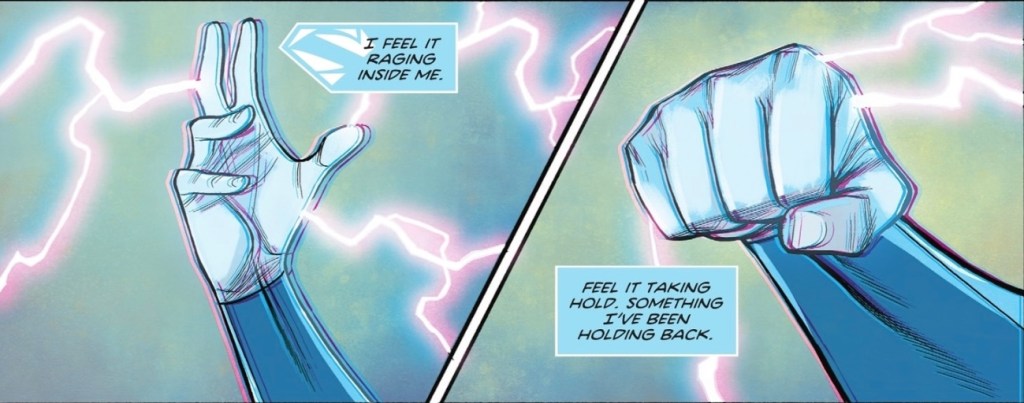 Blue, blue, electric blue… it seems the potential to be Electric Superman was passed to Jon by his father, who spent time as a living lightning bolt. I don’t know how long Jon will be able to move into this mode, but it was darn useful for catching Ultraman off-guard long enough for someone else to show up and – oh what the heck, this is a spoiler-tactic review…