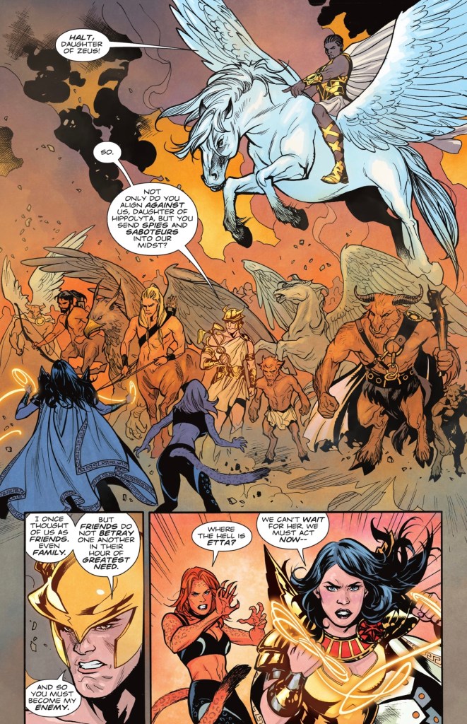 Sorry, I am just a bit fed up with some of this stuff DC is doing. On her own WW should be able to basically wipe the floor with all those monsters. She can basically take on a Kryptonian, and now she is a goddess. Why is she so weak and ineffectual? Why does she need Yara Flor and the Etta Squad? Not that teamwork isn’t a good thing, but I find the logic in the plot here a problem, like Wilson just doesn’t know these characters or she was told what to write by someone wanting certain characters to be featured.