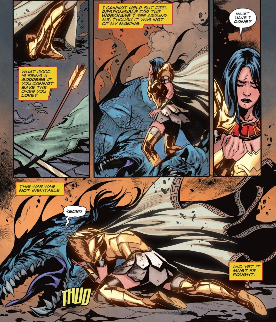 This reads like an amateur writer who has no experience with any of these characters. When I saw Phillipa and Hippolyta kiss, I knew I was the odd man out because I didn’t even know they ever had a relationship. Everyone is off. Steve Trevor literally has a handgun in a fight against gods. I don’t think anyone genuinely cared about this story, not editor, not writer, no one, which begs the question: what was the purpose of it?