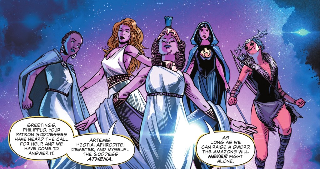 Before revealing her hand Hippo has a good old snog with girlfriend Philippa. Which is nice for them, but confusing to me – how does transitioning from Amazon to goddess work? If Hippo has physical form along with her new powers, why doesn’t she stick around Paradise Island permanently and protect her sisters? Her specific area of interest is described as ‘patron goddess of the Amazons’.