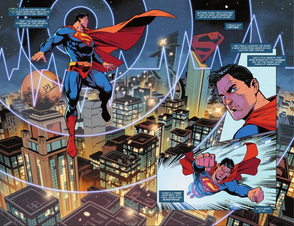 Confronting the crazed villain, Superman points out that his new green K-powered heart is made of Warworld mineral Genesis, a substance that boosts the Man of Steel too.