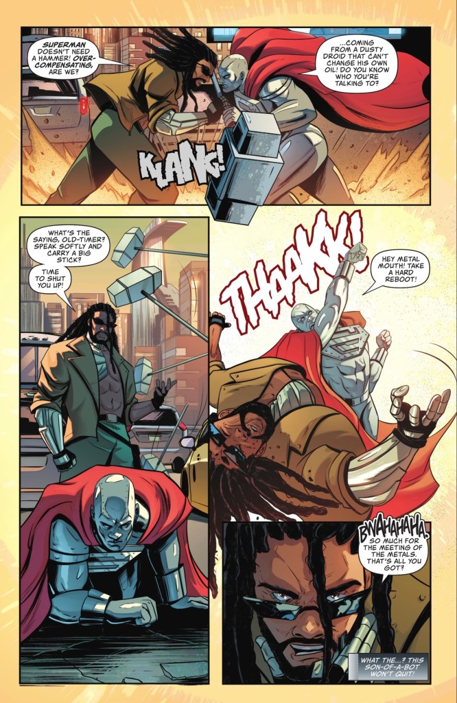 There certainly was one page in the Steel strip that did pull me up in terms of storytelling, Ben, when the hammer came into play during the fight scene (checks page number) on page 6 I couldn’t figure out the sequence of events.