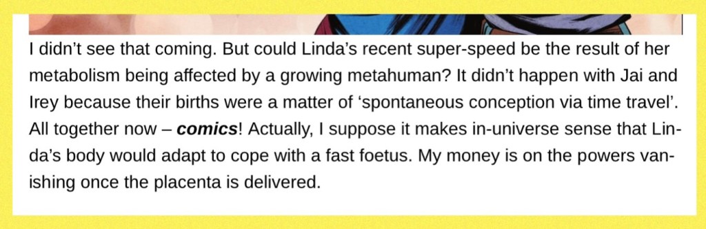 OK, it was pretty obvious to anyone who’s been reading comics for more than five minutes that mystery speedster Wade from the last couple of issues would be the baby in Linda’s belly, but give me a wee bit of applause for predicting our new mum’s super-speed journey last August.