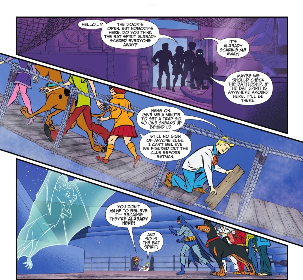 The title of this 12-issue mini-series may have to change as Mystery Inc are decidedly on the outs with Batman this issue. They show up to help when they learn of a Bat Spirit terrorising Gotham, but Batman has a new team of dog adjacent detectives to hand.