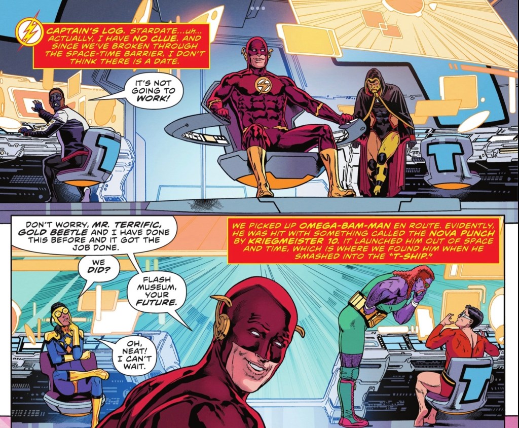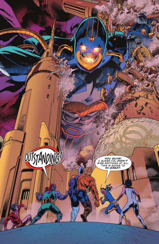 After two years and thirty-plus issues, writer Jeremy Adams is going out with a bang. Yeah, he has a story in next issue’s giant #900, but this feels like the real end of his run. We have Wally showing what a fine leader he’s become, classic DC villains and a fun supporting cast (one of whom gets a massive reward for his assistance). Not everyone gets a piece of the action – Phantom Girl isn’t even namechecked – but they’re all part of a fun tapestry, and I’m grateful for any acknowledgment that The Terrifics are still around. And I like the hint that Omega Bam Man may stick around with Terrifictech’s in-house super-team, he’s as much fun as Adams’ other creation, the delightfully bonkers Goldbug.