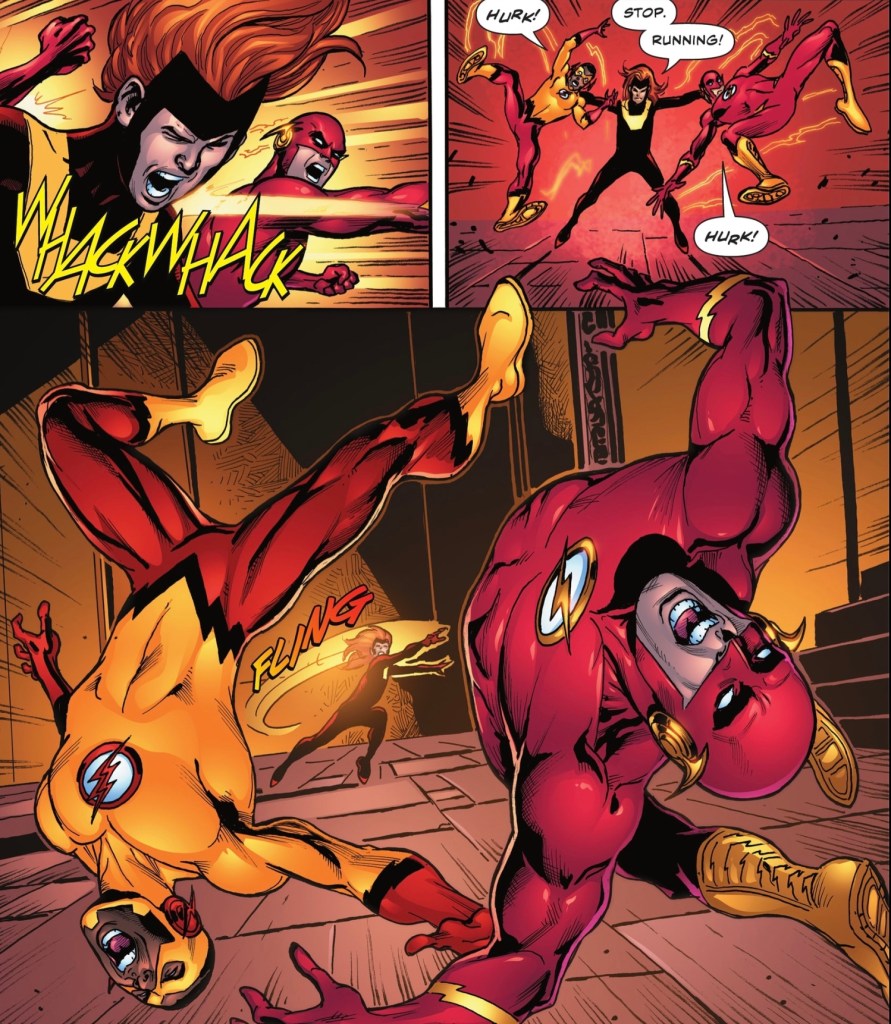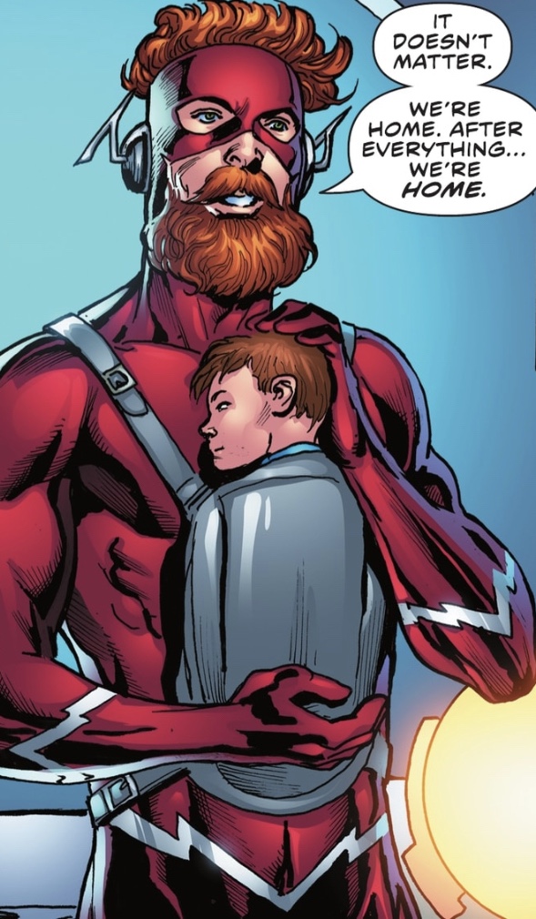 He really does need a shave. And a haircut. And what’s he doing in that nasty costume he wore for a while, right up through the abomination that was Heroes in Crisis? Yep, barely any time has passed for Linda and off-panel twins Irey and Jai, but months look to have passed for Wally. The sad thing is that Linda has lost out on spending time with her youngest, just as she lost relative years when, after turning three months, the twins aged up. Then again, given she’d miscarried them and they were restored via the wonders of time travel, she’s likely not complaining.