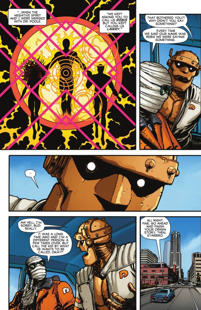Ah yes, Chris Burnham. The art here is a real treat, with some lovely ‘acting’ even from characters like Larry and Starbro, whose faces are covered. The way Burnham animates the Negative Spirit is especially nice, and I loved the flashback to the birth of Rebis in Grant Morrison and Richard Case’s Doom Patrol #19. The success of that image is also due to the work of colourist Brian Reber, who matches the original hues. When it comes to his own choices Reber is equally excellent, whether it’s something as simple as twilight or the way the GL rays play against the power of Negative Man in that knotty image a few pars back. Oh, and how about this colourful page showing us what the rest of the new Doom Patrol are up to as Larry and Cliff collect Starbro?
