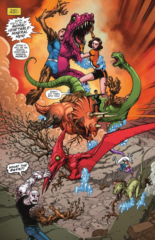 I certainly shan’t be sad if next issue we see the full encounter with Animal Vegetable Mineral Man. If this is all we get, though, well, we’ll always have bejewelled dinosaurs.