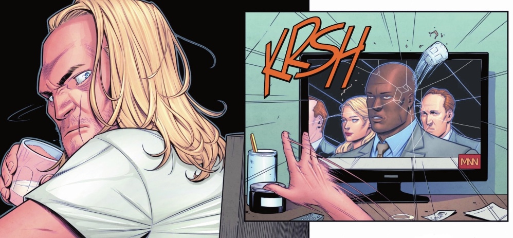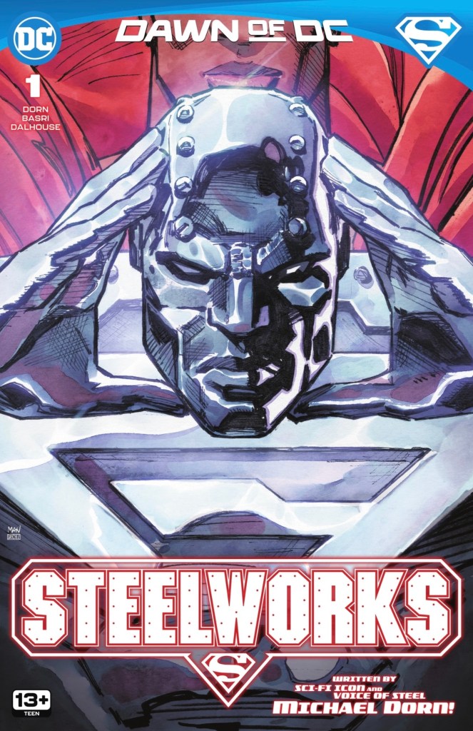 Clay Mann’s cover, coloured by Alejandro Sanchez, is surprisingly rough hewn. I’m used to slickness from Mann, and Steel is a character who invites a sleek finish… is this a case of a special shiny physical treatment not translating to digital? Still, it’s an eye-catching design with the unusual placement of the sharp logo helping – good choices from editors Jillian Grant and Paul Kaminski.