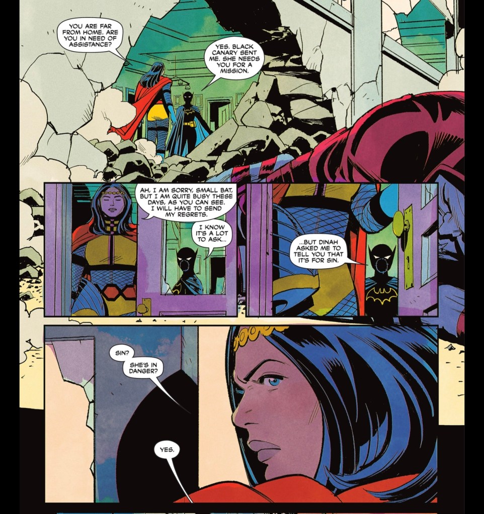 Centring the story on the search for Sin, who I don’t think has appeared since Gail Simone’s legendary BoP run, is an interesting choice. I’d forgotten about her, to be honest, but if we need someone with a personal connection to Dinah who isn’t also strongly linked to Green Arrow, she’s the choice.