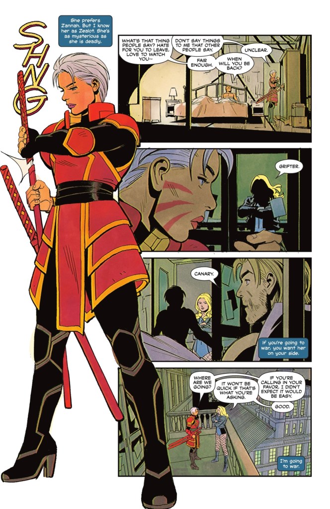 You are buying the book, aren’t you? It’s written by Kelly Thompson of Captain Marvel fame making her DC series debut and it’s full of her signature snappy dialogue, clever characterisation and well-placed action. Dinah is the legacy star of the show and is presented as the veteran power player she is, but far from perfect. Cassandra Caine is more fun than I’ve ever found her, Barda is a hoot and Zealot… I honestly have no idea, having not read anything with her in it. Why is Dinah whistling at her rather than just knocking on the door of the greenhouse in which she lives? Why is she coughing?