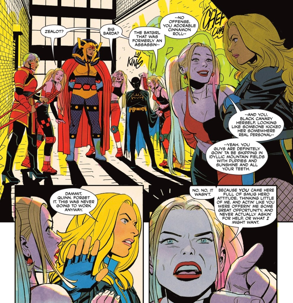 That’s four members. But Dinah needs someone else, an X factor, and asks for suggestions. Batgirl tentatively nominates Harley Quinn, whom she encountered awhile back. She tells the tale.. in her head, mostly.