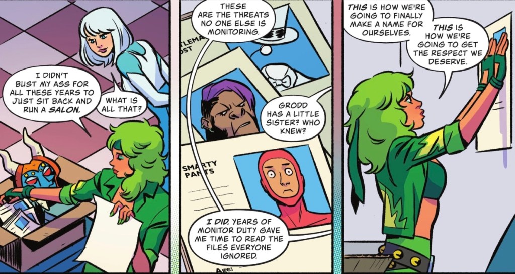 And they’re not alone. Former Justice League International major domo L-Ron is keen to help them settle in, arranging for them to rent a recently closed beauty salon with accommodation above. Bea and Tora don’t actually have any training in that department, but Fire has been a fashion model, so Ice reckons her chum can bodge it. Bea, though, has other ideas.