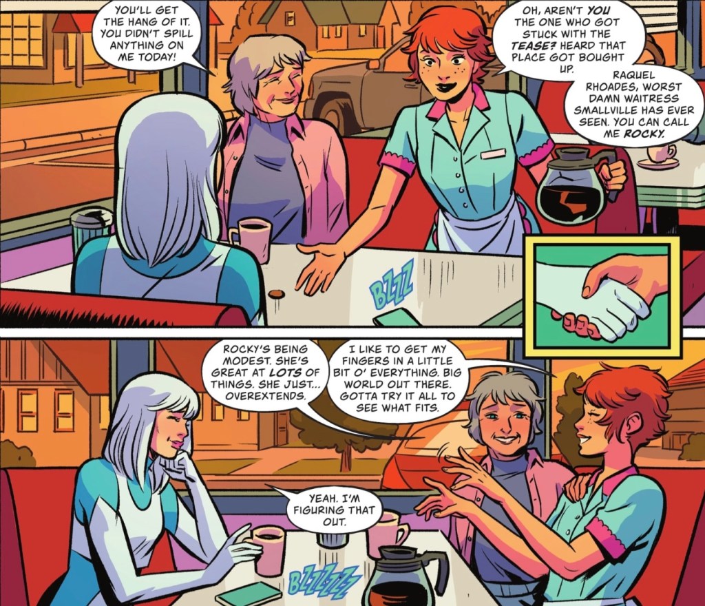 Superman always has his superhearing tuned for trouble in Smallville and he’s not thrilled at Bea endangering his old neighbours. Or his Mom, Martha Kent. Did you spot her there, cheering Fire on? Always ready to welcome a superperson in need of a home, she’s the Fire and Ice welcoming committee.