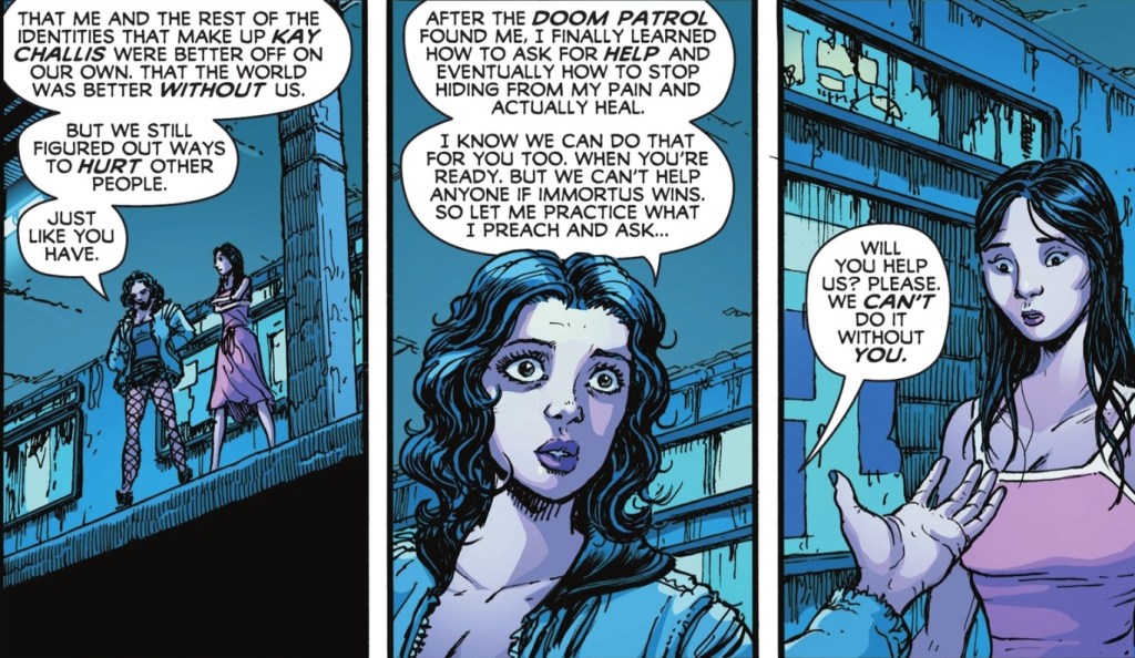 OK, Mento’s heretofore unmentioned ultimate power reserves are a tad convenient but one way or the other the DCU’s scrappiest team would win, so why not? Mento has been a mess since he was introduced in the Sixties, so it’s nice to see him get his moment in the sun. Similarly, the rehabilitation of original Chief Niles continues nicely, while pretty much all the regulars get a cool moment. I especially enjoyed seeing Crazy Jane again, she’s taken a backseat to her alter the Chief in this mini – she should always be around manifesting her shared selves, not being locked away by one of them. Which isn’t to say I’m not a fan of the Chief, her commitment to the Patrol’s current ‘saving the world by saving the monsters’ is commendable.