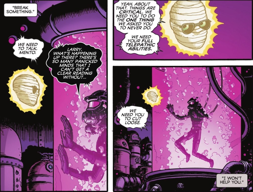 Elsewhere, the Chief, Elasti-Woman, Negative Man and other Patrol members and associates are tied up with the Brotherhood of Evil, sicced on them by Immortus as a distraction. And it’s working – radioed by Robotman to lend a hand, the Chief says she’s too busy. Intitially, anyway. She comes up with a plan that involves appealing to Sachiko, the young Japanese germophobe inside the Quiz, who can manifest any super power you don’t name. Negative Man Larry connects the Chief and Sachiko via his alien electricity nonsense, and the Chief’s Crazy Jane self can put her case.