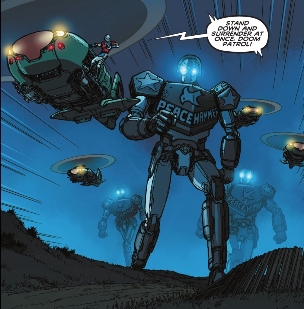 Seriously, a surprise character at the close of a Doom Patrol mini-series should be a Doom Patrol character. The shock return of Negative Woman. Or Madame Rouge. Heck, I’d even take midget menace Giacomo over the sodding Batwoman Who Laughs? Does she have any fans? It’s bad enough having Peacemaker show up.
