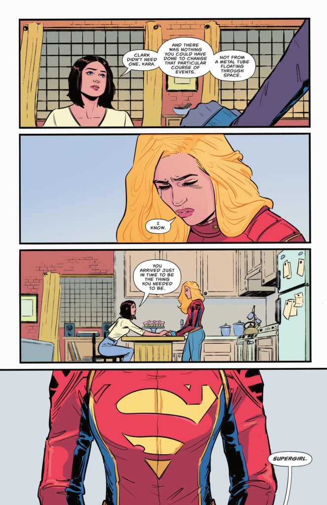 Colourist Marissa Louise also does a fine job, paying attention to how Kara’s hair would look at different times of day, and giving a dreamy tone to the Kryptonian flashback scene. And Becca Carey’s lettering choices are well thought out.