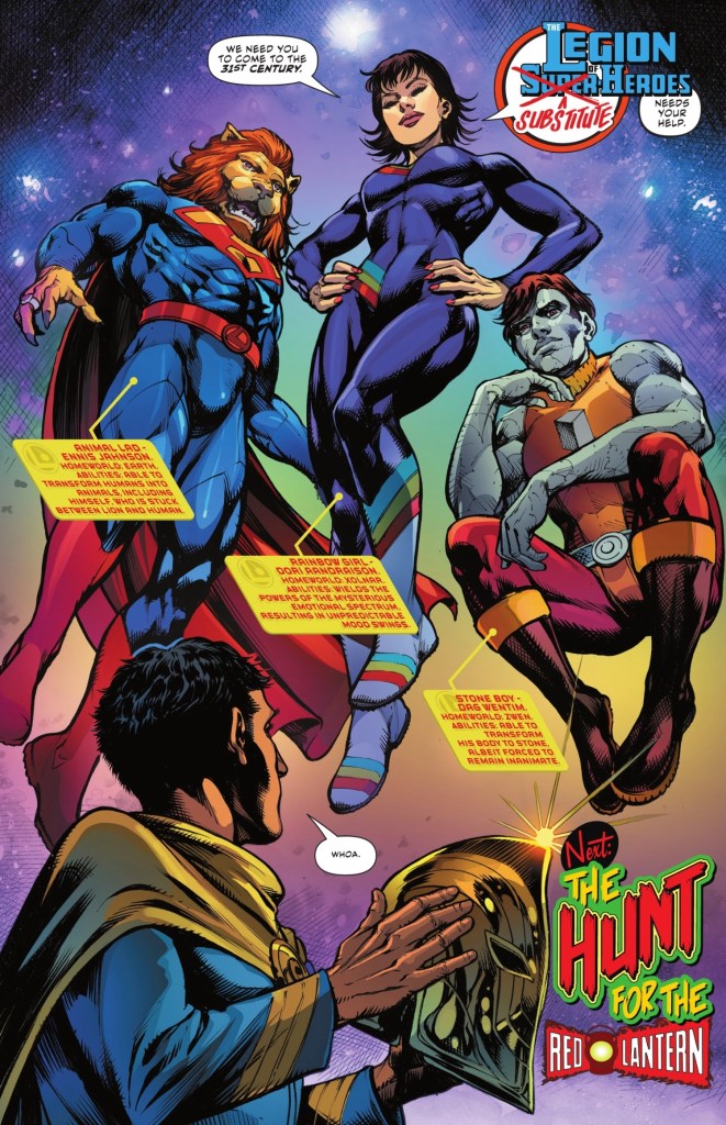 Did anyone see that coming from writer Geoff Johns? Classic Substitute Hero Stone Boy. Another Legion of Super-Heroes reject, Rainbow Girl, who eventually joined the Subs after Johns linked her power to the Green Lantern emotional spectrum. And Animal Lad, another LSH wannabe, unseen since his original appearance in the early Sixties and rocking one of Superman’s most famous Red Kryptonite looks.