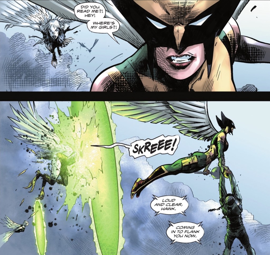 As well as Hawkgirl and Green Lantern Jo Mullein – she’s generating the force shield – there’s an expert on mythical beasts to hand… Wonder Woman.