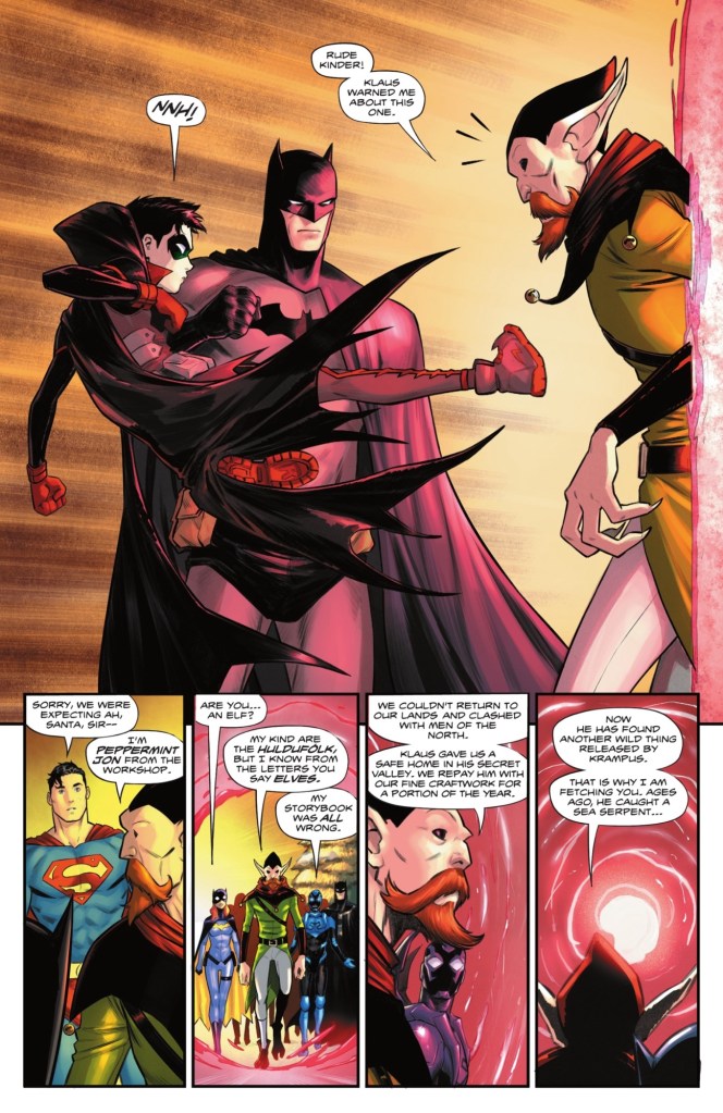 Outside Gotham City, Santa sends a lieutenant to help Batman, Robin, Batgirl, Nightwing and the newly arrived Blue Beetle, Black Canary, Miss Martian, Green Arrow and Superman tackle the Christmas Crisis.