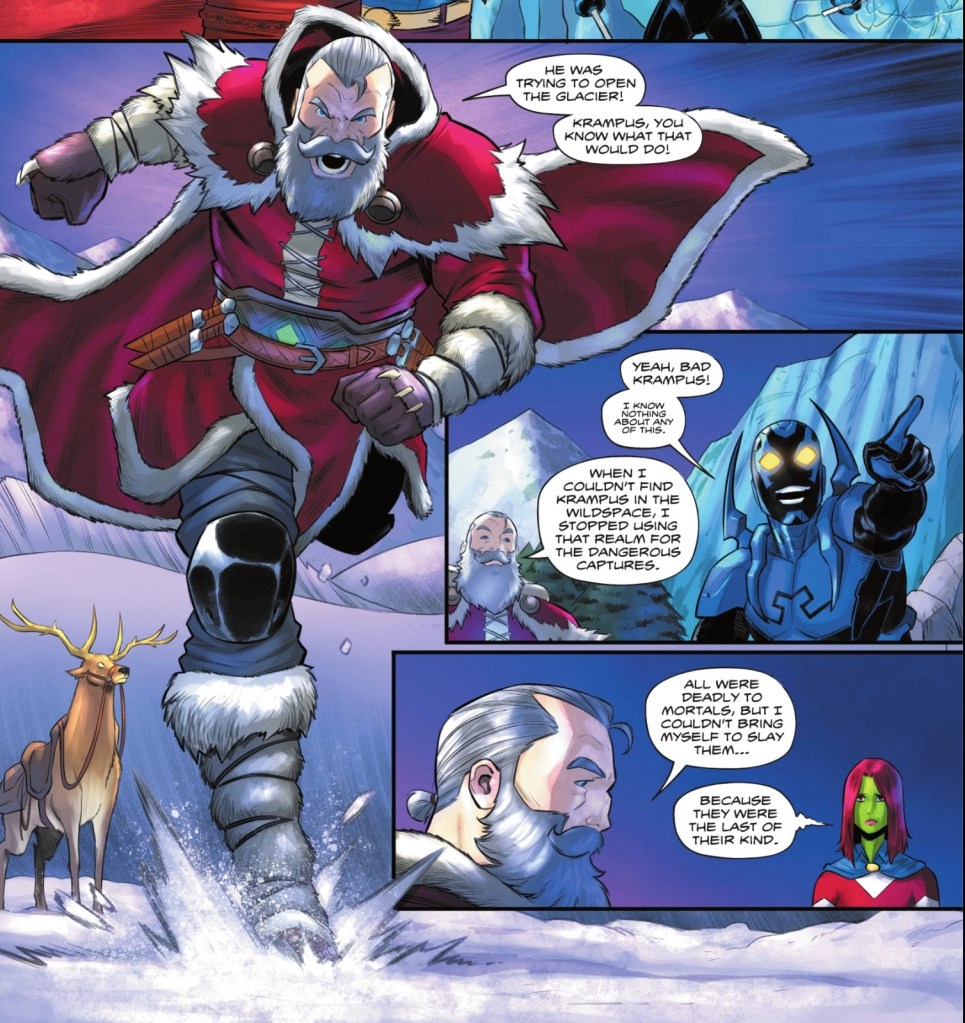 Highlights of Jeff Parker’s story include Wonder Woman ending a violent situation in a non-violent manner – there’s no sign of the character-inappropriate sword she’s been stuck with since the New 52 – and the running gag of Santa remembering the address and Christmas list of everyone he meets. And I’m pleased at the strong hint that someone is possessing lovely old Krampus… but who would the enemy of Christmas be? The Easter Bunny?