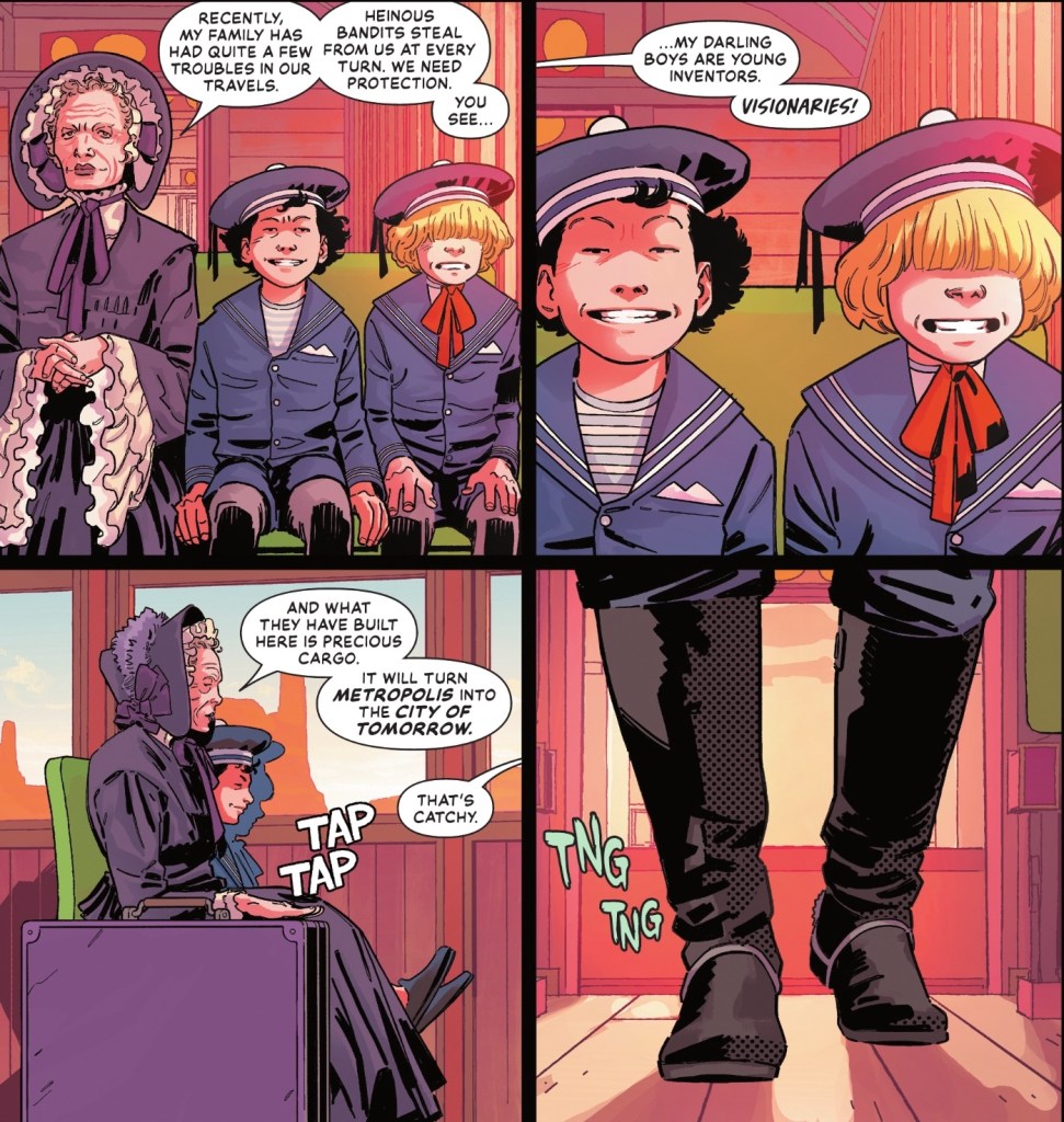 Last issue ended with Superman, suddenly more than a century in the past, declaring he was going to rob a train. This time we learn that the people he picked on were Pharm and brother Graft when they were beastly boys, and their gruesome mother.