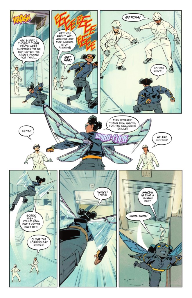 The secret origin of Bumblebee proves to be the same as that of most other tech-based heroes – she’s a genius with a soldering iron and access to materials. Mentored by her Aunt Birdie, who tweaks prosthetics for local kids, Karen Beecher comes up with her wings and a spy bee to get evidence that an electronics store is making shoddy goods. The name of the shop is Bucklin, and characters talk about it as if it’s something we should recognise, like Roxxon or Luthorcorp. It turns out to be owned by Simon Stagg, but Stephanie Williams’ story is a little too calm, a designed-to-inspire YA entry – there’s no oomph. The nearest we get to action is Karen flying away from a couple of workers in overalls. Artist Rosi Kämpe draws that well. She draws everything well, I just wish she had something more engaging to draw. This story is fine, but oh so polite. Even Jordi Bellaire’s colouring is uncharacteristically bland.