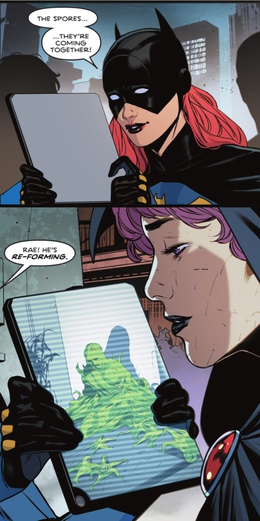 Raven is fighting Dr Hate, now revealed as a Dark Raven who’s been hiding in her head jewel. Raven urges the Titans not to kill any more spores.