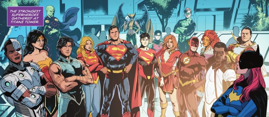 So yes, Superman is there with several of his Justice League colleagues. I know DC is currently insisting the Titans are all any universe needs, but that doesn’t mean the experience of the JLA members can’t be useful. For goodness’ sake, Nightwing is bouncing ideas off Detective Chimp. I get that Beppo is a top sleuth, but J’onn J’onzz, Hawkgirl and friends might have an idea or two. Heck, Wonder Woman has extensive experience with bestiomorphs, maybe she could do a deal with Circe for some magical help?