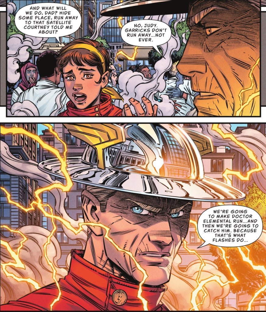 The story by Jeremy Adams is beautifully plotted and his script full of sharp lines and personality – this month’s pun-off between Jay and that steely secretary is a hoot, but it doesn’t delete the drama. Flash Sr and Jr, even though they’re only recently reunited after decades of being apart, have great chemistry. And Adams shows us the fighting spirit of a true hero.