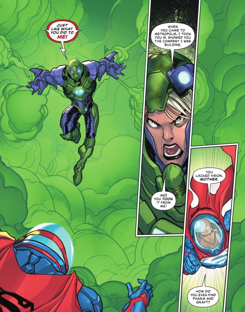 Their problems are Dr Pharm, a cloud of green kryptonite tweaked to kill regular human beings and Lex’s mad mother Leticia.