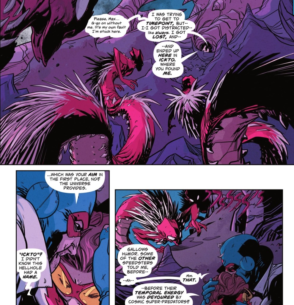 Last issue ended on quite the cliffhanger, with a classic Flash rogue declaring themselves in the game, so it’s a surprise that we open with Max Mercury and Impulse… somewhere. Last time we saw Bart he was speeding off to find Max, who had been lost as he helped Wally West check out his newfound ability to slide between levels of reality. He’s somehow caught up to the senior speedster, but things aren’t going smoothly.