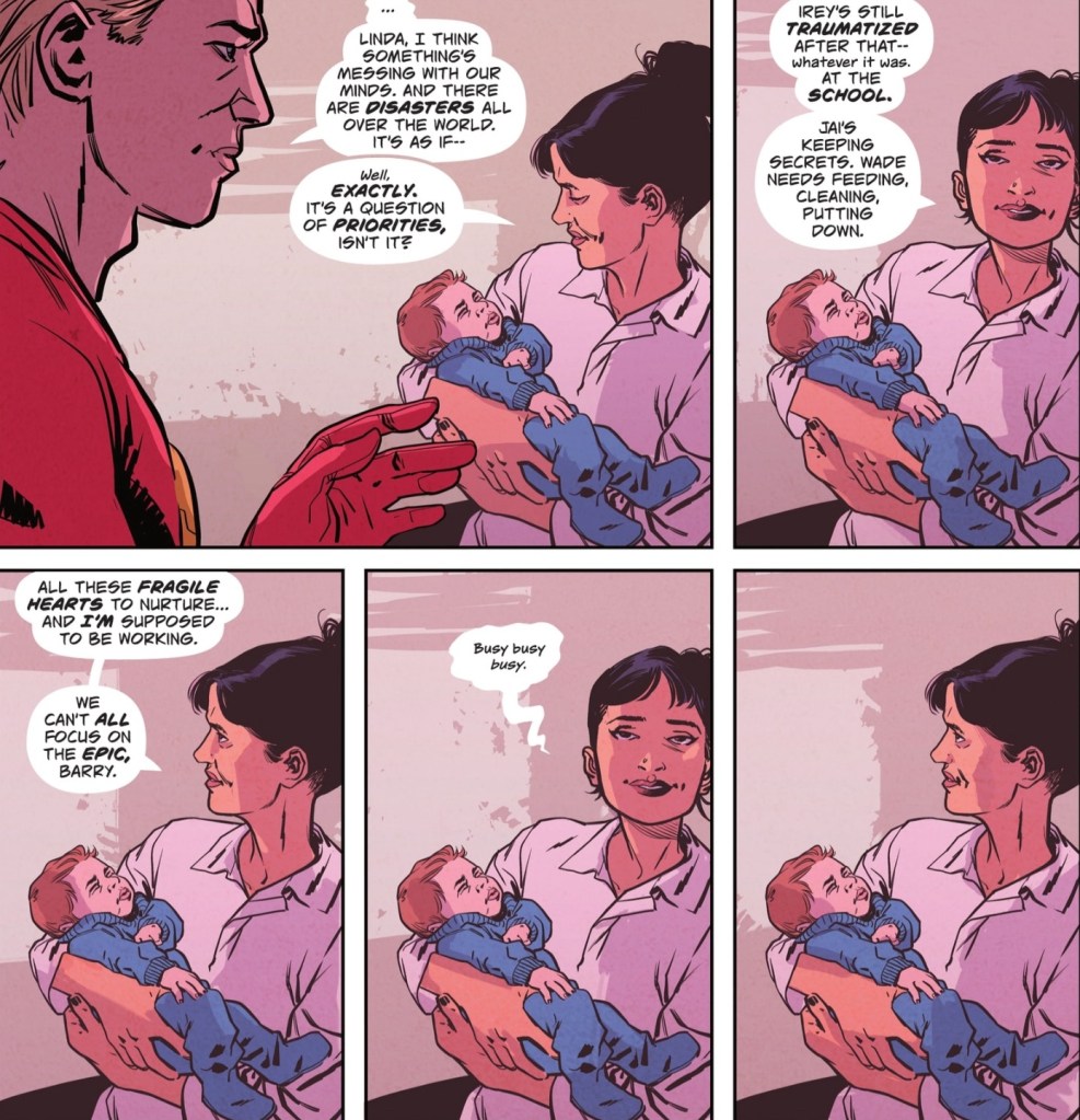 Back in regular reality, Barry Allen seems to finally be coming out of the funk he’s been in since the start of this run. But Wally’s wife Linda is sliding further into a weird state of denial that could previously have been mistaken for Busy Mom Fugue.