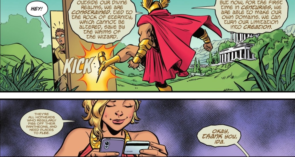 (Update: I asked Josie Campbell on Twitter/X about the art split and she was kind enough to share: ‘Mike drew a lot of the inter dimensional pages where we’re seeing the gods and the Things That Wait, but he and Emma did such a great job collaborating that the transitions between their pages are very seamless!’)