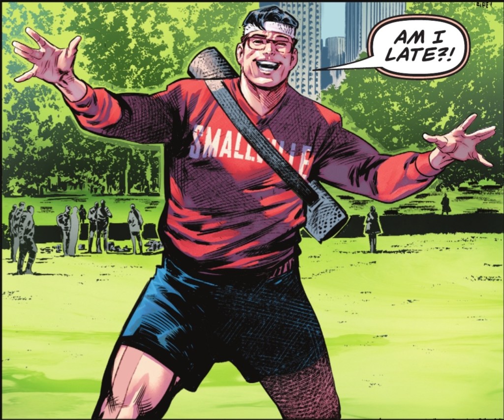 Yep, Superman is on patrol but soon he’s on the scene as Clark, the epitome of Hot Dork.