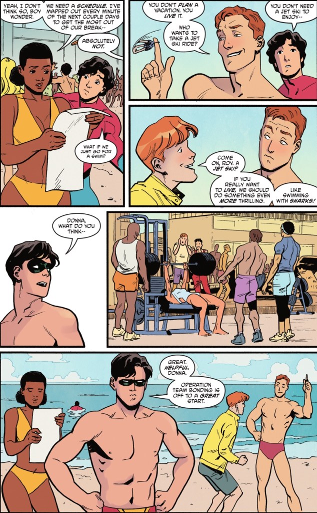 The first story had a breakout if not a Spring Break, the second tale gets away with it via a single caption, but the third story goes all in with the beach vibe. We’re back in the early days of the Teen Titans and Robin drags everyone to the coast for some bonding. It doesn’t come easy but, happily, a supervillain shows up and everyone is happy. Randomly, the Fearsome Five turn up for a beach volleyball game that seems to involve Donna donning a mask and handling giant jigsaw puzzle pieces. Which is stupid, but heck, it brought back happy memories of that time the JLA met the Secret Society of Super-Villains on the baseball field. Writer Meghan Fitzmartin does OK with a lesson about listening but a key plot point involving Aqualad noticing something strange is bungled in that nothing strange seems to be happening before said bad guy enters via a cracking splash from the talented Gavin Guidry, who provides sharply, attractive art throughout.