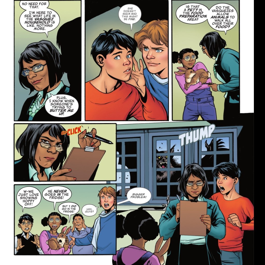 Noe that one, I mean Shazam! Anyway, that’s an ugly critter, and a great panel, courtesy of Emanuela Lupacchino, who gives us page after page of page of clear, great-looking storytelling. She handles the large cast of characters – six kids, two parents, social worker, one magical bunny, a talking tiger and dozens of giant bat people – with practised care. The panels are busy, but never cluttered, with lovely little bits of body language and lots of background details. The superheroics are convincing, with Billy helping Mary out in between his interview with harried social worker Ms Sharma, while the issue kicks off with a sharp dream sequence that begins with the banal and amps up to ‘spooky’.